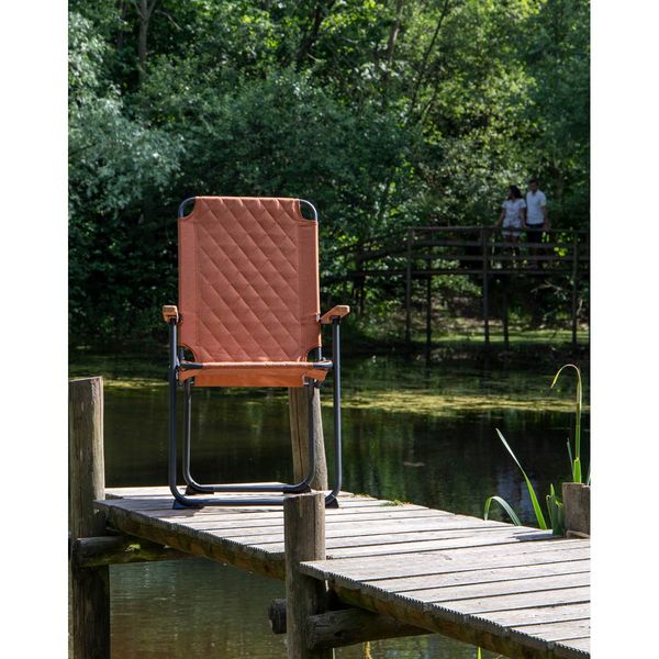 An extra high and wide comfortable folding chair. The classic with a modern industrial look. A chair that combines style, comfort and functionality. Equipped with a padded Cationic upholstery for ultimate comfort, a lightweight aluminium frame and bamboo armrests. In addition, the stitching has a modern pattern. An ideal chair for the garden or camping, but also on the balcony and in the living room. In addition, this chair is equipped with extra stabilizers and a 'safety-lock' against unwanted folding. Compact to take with you.