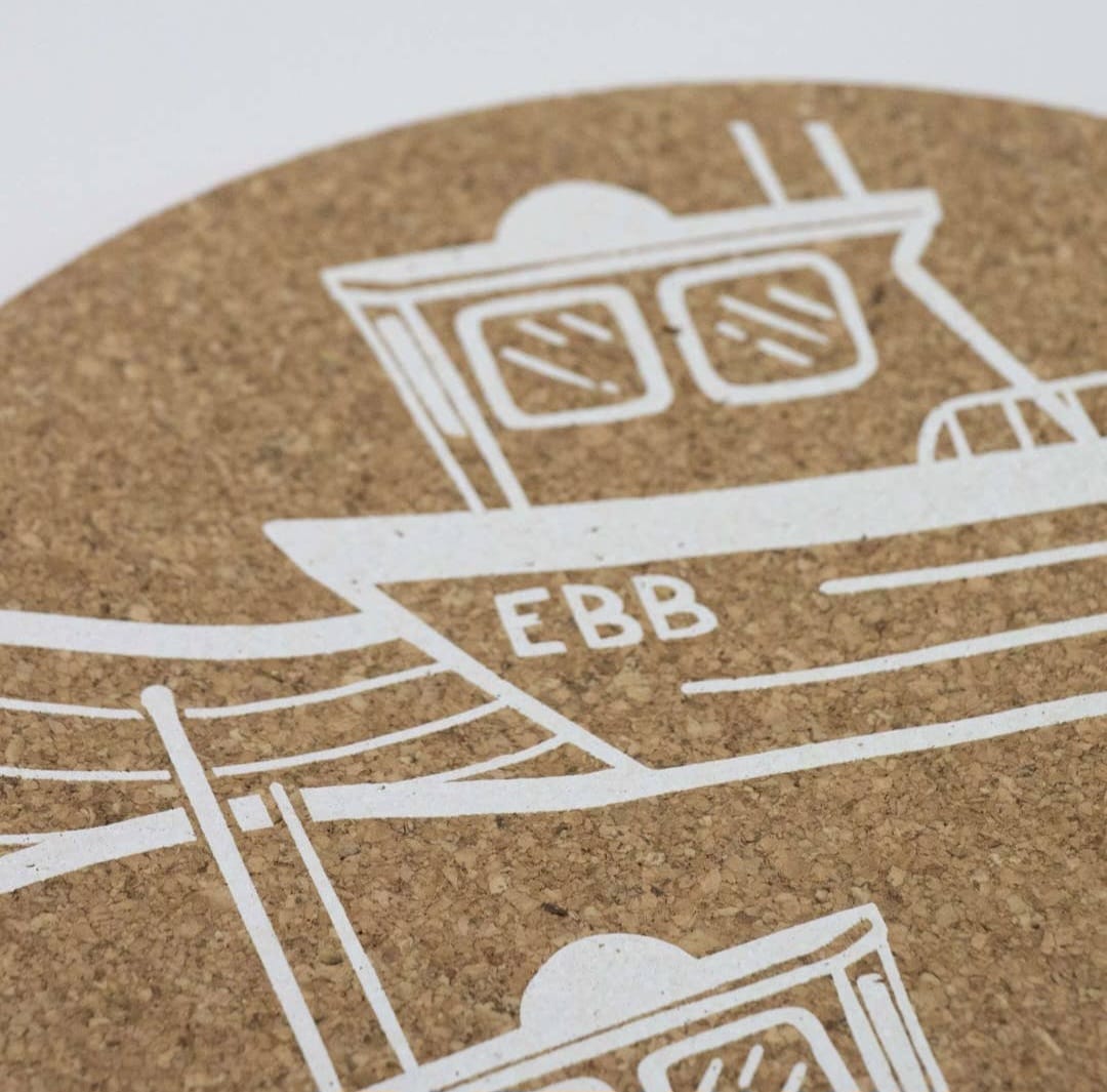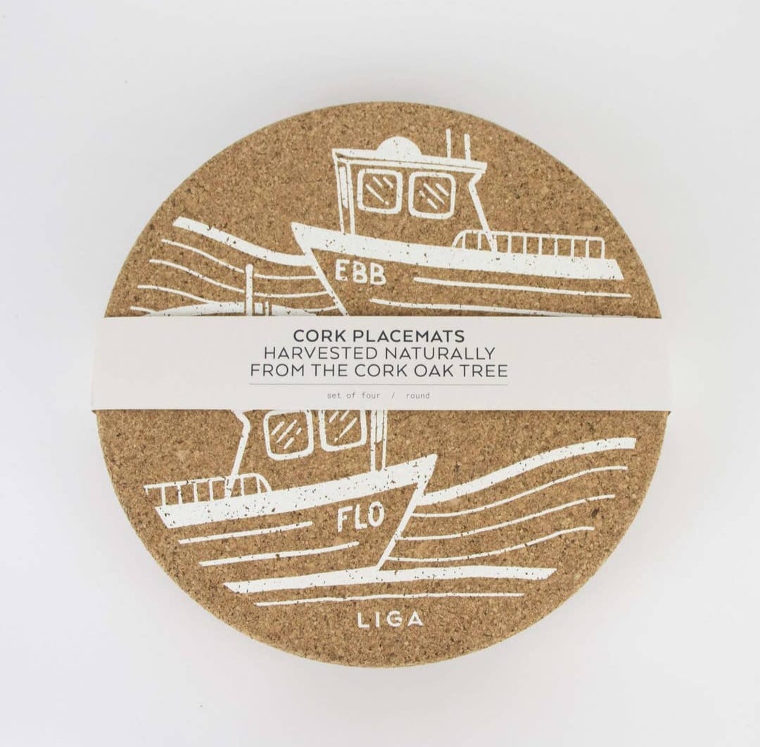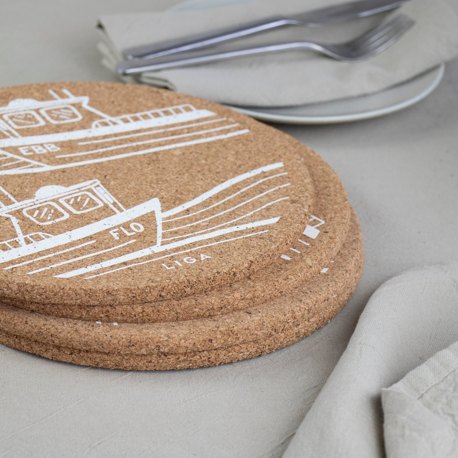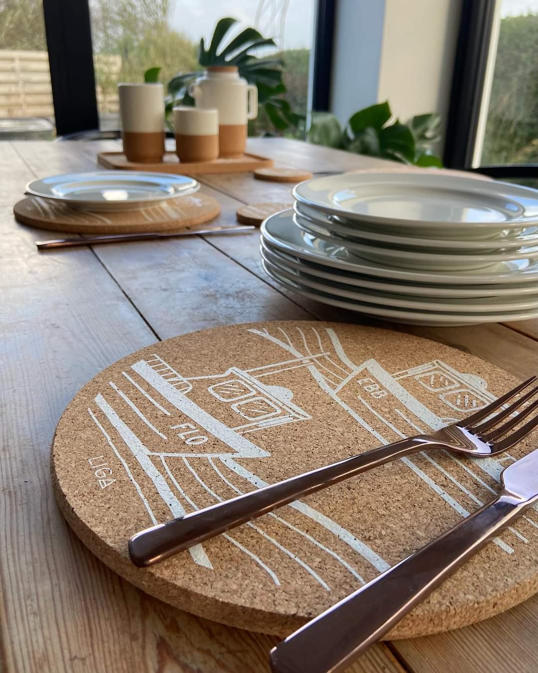 Organic cork placemats with simple contemporary designs. Inspired by nature, grown in Portugal, hand printed in Cornwall. These come as a set of 4. Sustainable Materials Cork is harvested naturally without harming the tree. The cork oak forests in Portugal offset ten million tonnes of carbon every year, and the more cork we use in our everyday lives the more cork oak trees will be planted. Cork really is a living breathing material, it continues to absorb C02 even as a LIGA product. Care Wipe clean with a damp cloth Good for indoor and outdoor dining. All of our printed placemats are not heatproof, warm to touch plates only due to the ink on the placemats + coasters Dimensions D25 cm H10 mm Plastic Free Packaging Our organic cork placemats + coasters sets are wrapped in a simple eco paper band. We use zero plastic in our packaging. Sustainable Living and eco giving.