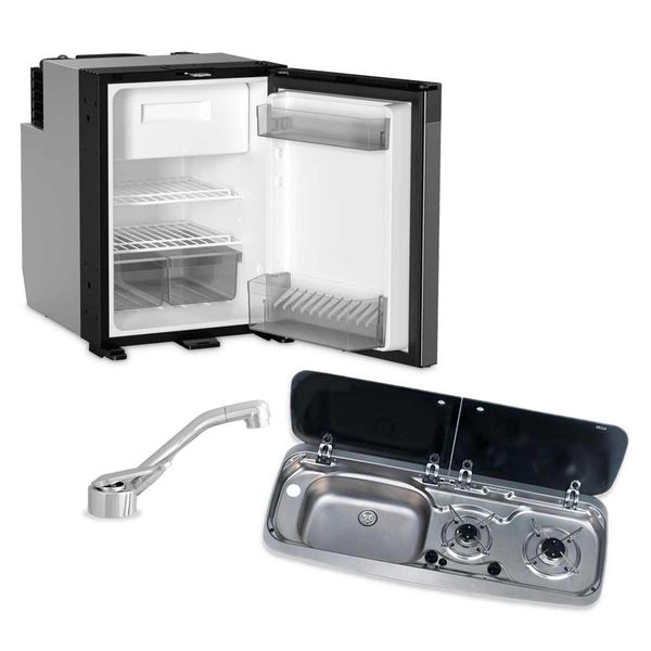 Created with campervan conversions in mind, this bundle is made up a compressor fridge, a combination unit with a double hob on the left side and sink on the Left, and a single lever cold water tap.