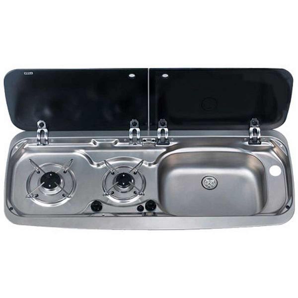 The Dometic 9222 combination unit features two gas burners with piezo ignition on the left side and a sink on the right. The hob has chrome pan supports with enamelled burner caps and the unit measures 900mm Wide x 152mm High x 370mm Deep all together.