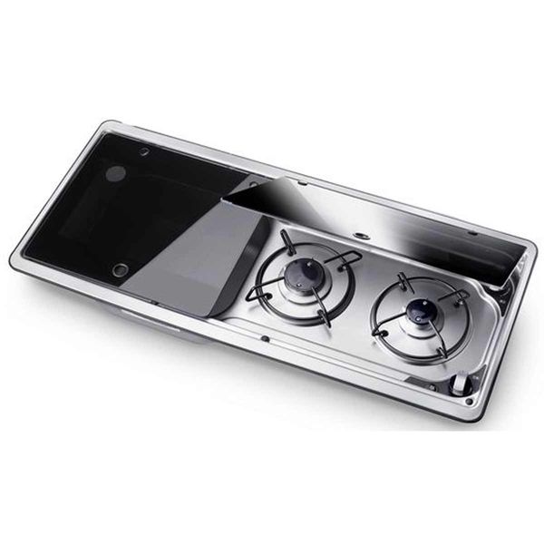 The Dometic 9722 combination unit features two gas burners with piezo ignition on the left side and a sink on the Left. The hob has chrome pan supports with enamelled burner caps and the unit measures 900mm Wide x 152mm High x 370mm Deep all together.