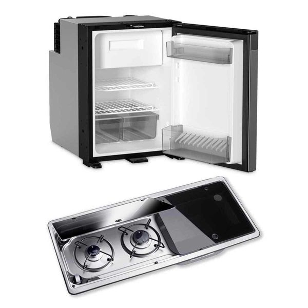Created with campervan conversions in mind, this bundle is made up a compressor fridge and a combination unit with a double hob on the left side and sink on the right.